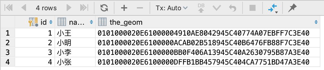 INSERT INTO users (id, the_geom, name) VALUES (4,ST_GeomFromText('POINT(114.317853 30.479799)',4326),'小张');