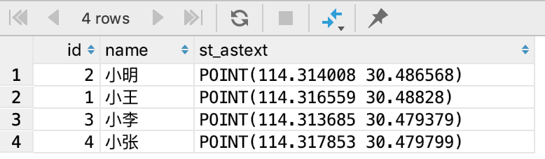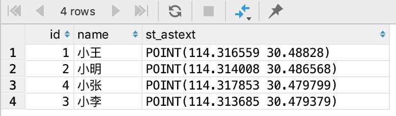 现在把小王的坐标位置POINT(114.316559 30.48828)附件的人按距离排序: