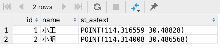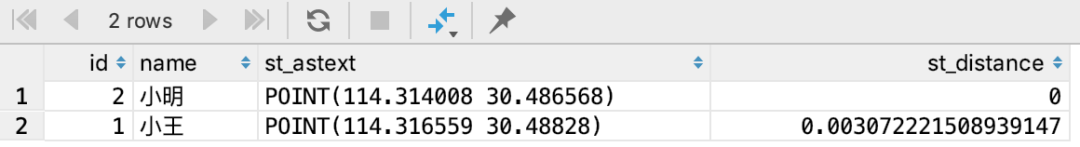 where name in ('小明', '小王') order by st_distance(the_geom, ST_GeomFromText('POINT(114.314008 30.486568)',4326));