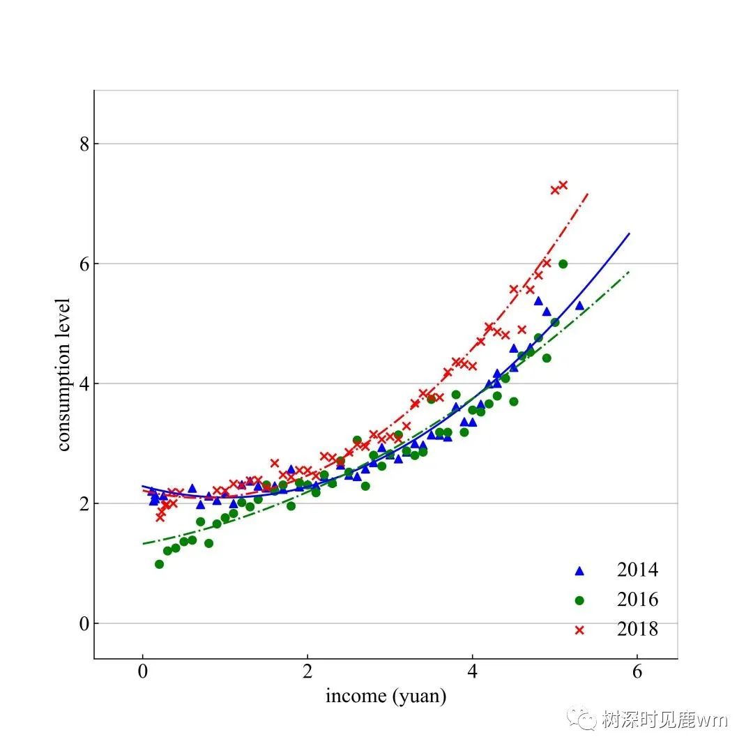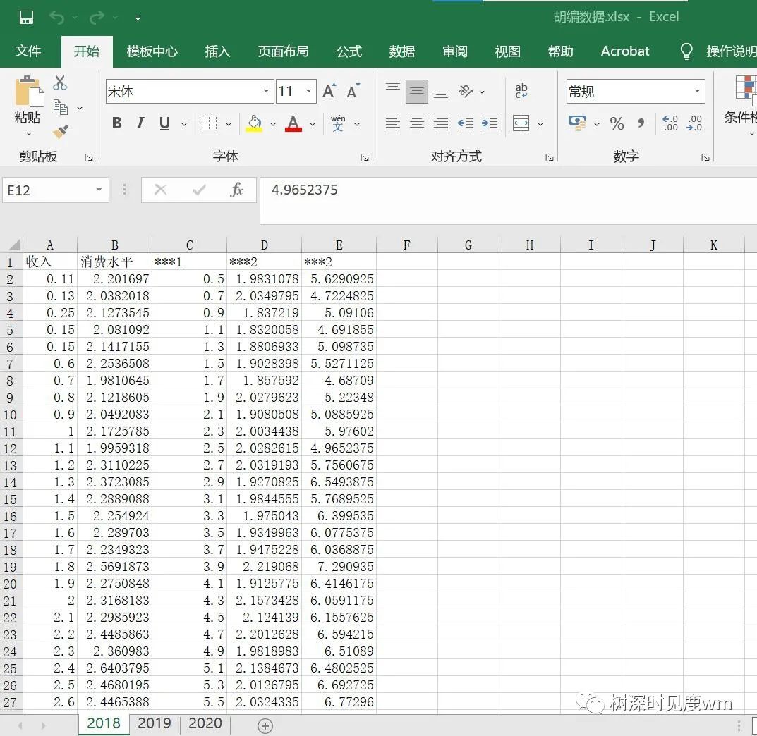 【原始数据分析】由于数据肯定是不能公布的,故我胡编了以下数据(软件自动生成的),就假装是2018、2019、2020年不同地区的收入、消费水平等指标数据吧(图1)。从表格数据来看,各表结构一致,均为字段名加数据格式,各字段下均有50条数据,字段名为单一单元格。故绘制散点图的思路是:确定所用年份和横纵坐标——从excel中按确定的横纵坐标获取数据——完成图幅整饰——绘制散点图——回归拟合绘制趋势线——导出图片。