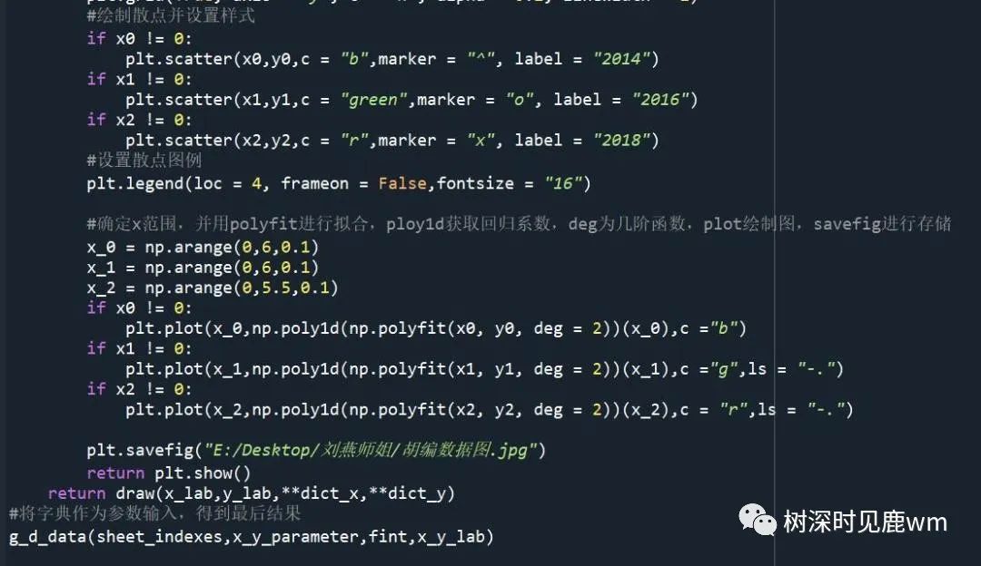 (三)利用pyplot对图片横纵比例、分辨率、坐标刻度值、横纵坐标字体、脊柱、网格等进行设置,并利用scatter绘制输入参数的散点图,利用ployfit进行回归拟合,用savefig存储图,最后将字典作为参数输入得到最后结果。