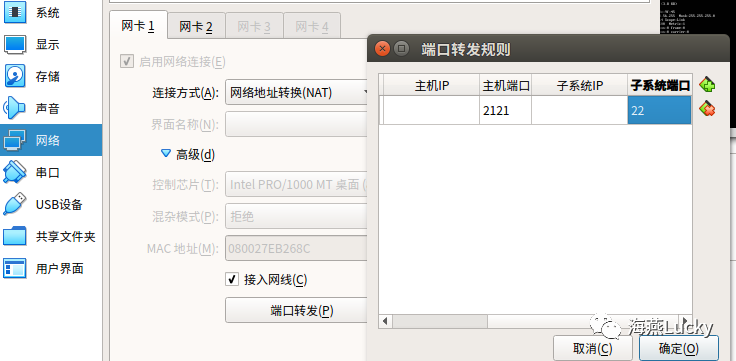 3.然后在虚拟机,设置中添加端口转发,路径是:设置->网络->高级->端口转发,网络连接方式选择NAT。注意主机端口不能是已占用的端口。
