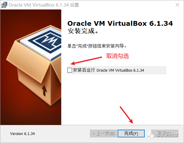 11.取消勾选“安装后运行Oracle VM VirtualBox6.1.34”,并点击“完成”;