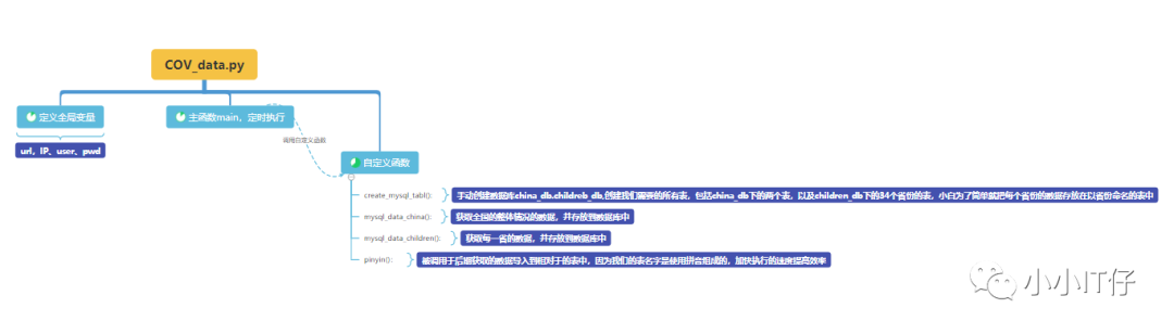 标题:爬取腾讯的疫情更新数据,保存至mysql中使用库:request json pymysql time datetime pypinyin框架分析:1.准备好我们可以获取数据的url,并使用requests模块,将数据捕捉下来2.对爬取的内容进行解析,因为爬取到的内容为js格式,(str),为了后续好匹配,使用py自带json模块将str转为字典格式,作为我们步骤下来的我们想要的数据的数据使用json的keys()看到有两个key,对我们有用的数据为"data"的数据,将匹配到的"data"的数据转为字典格式,并作为我们后面需要匹配的根数据。3.数据库表的创建,(只用执行一次)手动创建两个数据库,china_db,children_db用于存放表。(注意,要给我们在函数中用到的user关于两个数据库的权限才能创建表。函数create_mysql_table,用于创建我们需要的所有表,包括china_db下的两个表,以及children_db下的34个省份的表,小白为了简单就把每个省份的数据存放在以省份命名的表中。使用for循环一条语句创建34个表,提高效率。4.从根数据()获取我们想要的数并存储,全部依靠字典匹配方式,如果遇到list格式先转为字典格式再匹配。(定期执行)函数mysql_data_china():获取全国的整体情况的数据,并存放到数据库中函数mysql_data_children():获取每一省的数据,并存放到数据库中5.使用汉字转拼音的函数pinyin(),导入模块pypinyin,被调用于后期获取的数据导入到相对于的表中,因为我们的表名字是使用拼音组成的,加快执行的速度提高效率