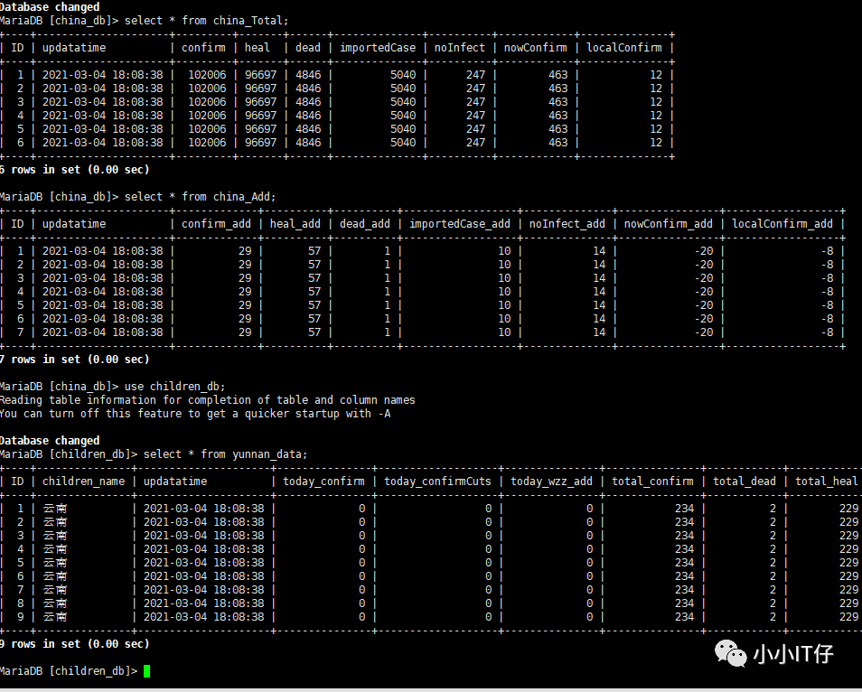 sql:create table yn_data(ID int(11) primary key auto_increment,updatatime datetime,today_confirm int(11),today_confirmCuts int(11),today_wzz_add int(11),total_confirm int(11),total_dead int(11),total_heal int(11),nowConfirm int(11),total_suspect int(11),total_wzz int(11));