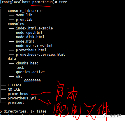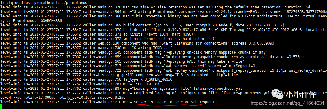 [root@localhost ~]# mkdir prometheus && chown -R root:root prometheus[root@localhost ~]# cd prometheus[root@localhost prometheus]# tar -zxvf prometheus-2.24.1.linux-386.tar.gz[root@localhost prometheus]# cd prometheus-2.24.1.linux-386/[root@localhost prometheus-2.24.1.linux-386]# cd ..[root@localhost prometheus]# ln -s prometheus-2.24.1.linux-386 prometheus[root@localhost prometheus]# lltotal 62100lrwxrwxrwx 1 root root 27 Jan 26 23:09 prometheu -> prometheus-2.24.1.linux-386drwxr-xr-x 4 3434 3434 132 Jan 19 18:10 prometheus-2.24.1.linux-386-rw-r--r-- 1 root root 63587661 Jan 22 04:23 prometheus-2.24.1.linux-386.tar.gz[root@localhost prometheus]# cd prometheus[root@localhost prometheus]# lltotal 145780drwxr-xr-x 2 3434 3434 38 Jan 19 18:08 console_librariesdrwxr-xr-x 2 3434 3434 173 Jan 19 18:08 consoles-rw-r--r-- 1 3434 3434 11357 Jan 19 18:08 LICENSE-rw-r--r-- 1 3434 3434 3420 Jan 19 18:08 NOTICE-rwxr-xr-x 1 3434 3434 79203846 Jan 19 16:16 prometheus-rw-r--r-- 1 3434 3434 926 Jan 19 18:08 prometheus.yml-rwxr-xr-x 1 3434 3434 70051362 Jan 19 16:18 promtool[root@localhost prometheus]# ./prometheus