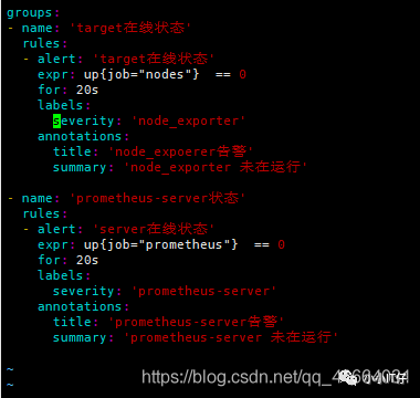 groups:- name: 'target在线状态'rules:- alert: 'target在线状态'expr: up{job="nodes"} == 0for: 20slabels:severity: 'node_exporter'annotations:title: 'node_expoerer告警'summary: 'node_exporter 未在运行'- name: 'prometheus-server状态'rules:- alert: 'server在线状态'expr: up{job="prometheus"} == 0for: 20slabels:severity: 'prometheus-server'annotations:title: 'prometheus-server告警'summary: 'prometheus-server 未在运行'