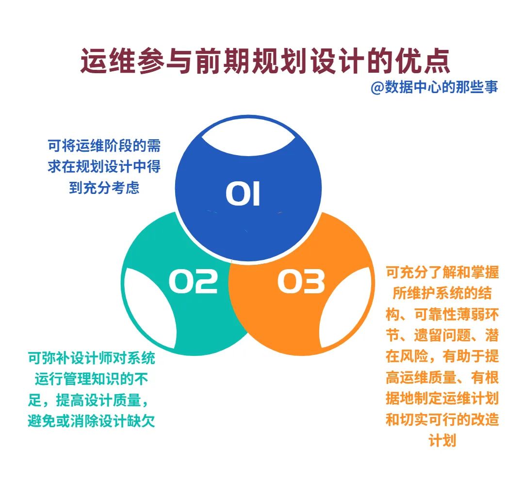 运维参与前期规划设计,可将运维阶段的需求在规划设计中得到充分考虑;可弥补设计师对系统运行管理知识的不足,提高设计质量,避免或消除设计缺欠。运维参与前期规划设计,可充分了解和掌握所维护系统的结构、可靠性薄弱环节、遗留问题、潜在风险,有助于提高运维质量、有根据地制定运维计划和切实可行的改造计划。
