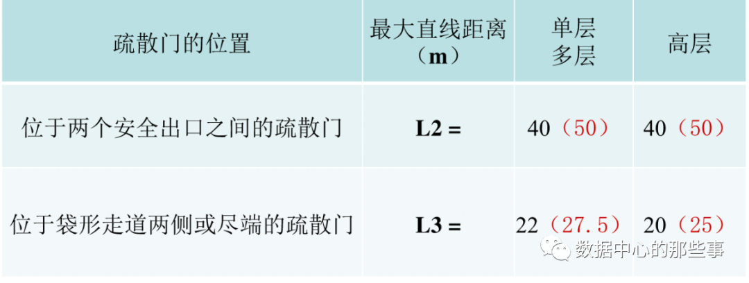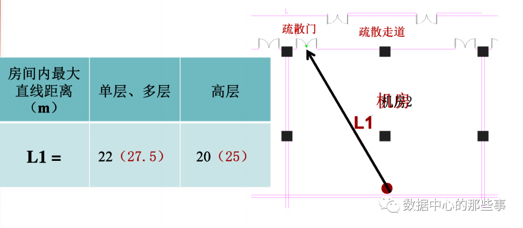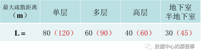 当数据中心按照厂房(丙类)进行设计时,数据中心内任一点到最近安全出口的直线距离不应大于下表规定。当主机房设有高灵敏度的吸气式烟雾探测火灾报警系统时, 主机房内任一点到最近安全出口的直线距离可增加50%。