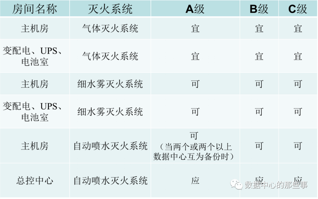 B级和C级数据中心的主机房宜设置气体灭火系统, 也可设置细水雾灭火系统或自动喷水灭火系统。
