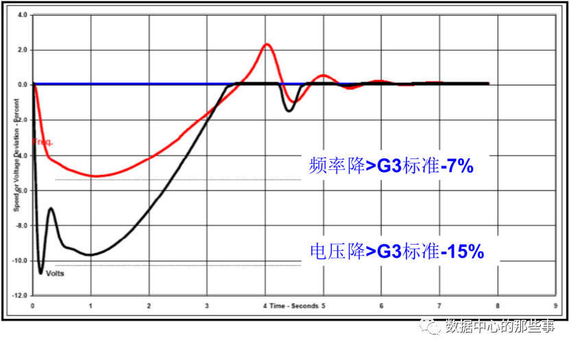 柴发满足G3/G4等级时的突加载能力,YDT502要求突加载50%时频率降小于7%,电压降小于15%.