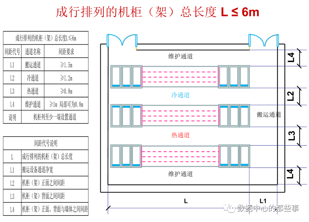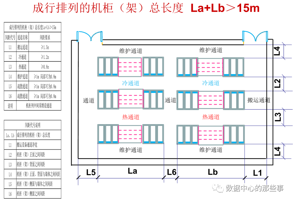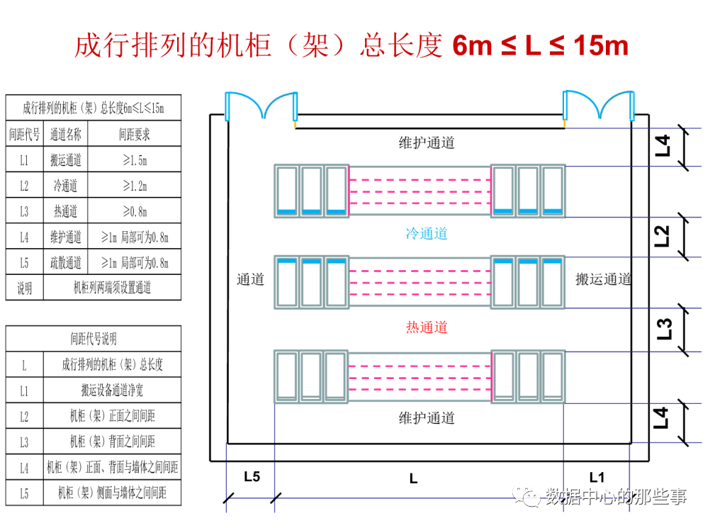 成行排列的机柜(架),其长度大于6m时,两端应设有通道;当两个通道之间的距离大于15m时,在两个通道之间还应增加通道。通道的宽度不宜小于1m,局部可为0.8m。