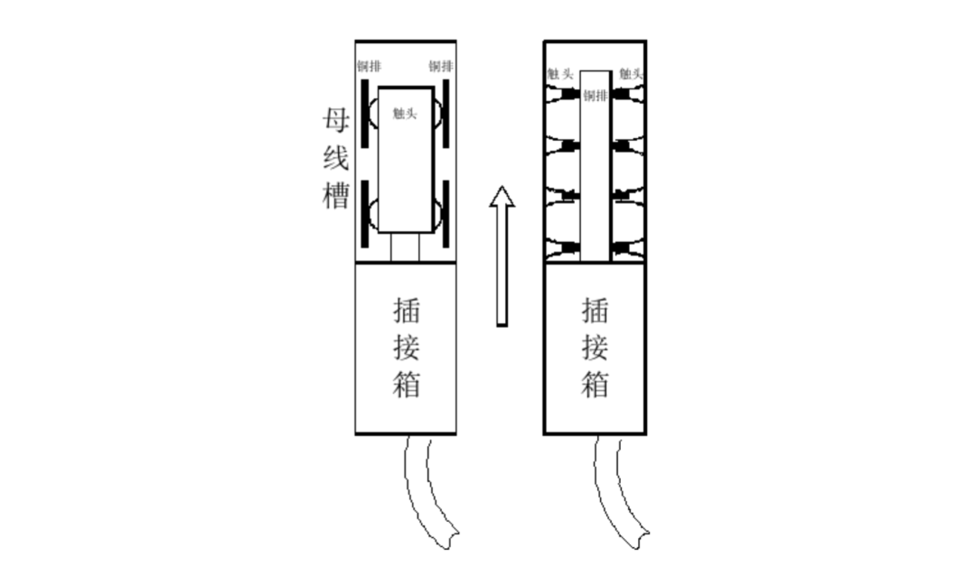 其插接箱从垂直方向安装,插接箱固定在母线槽底部。