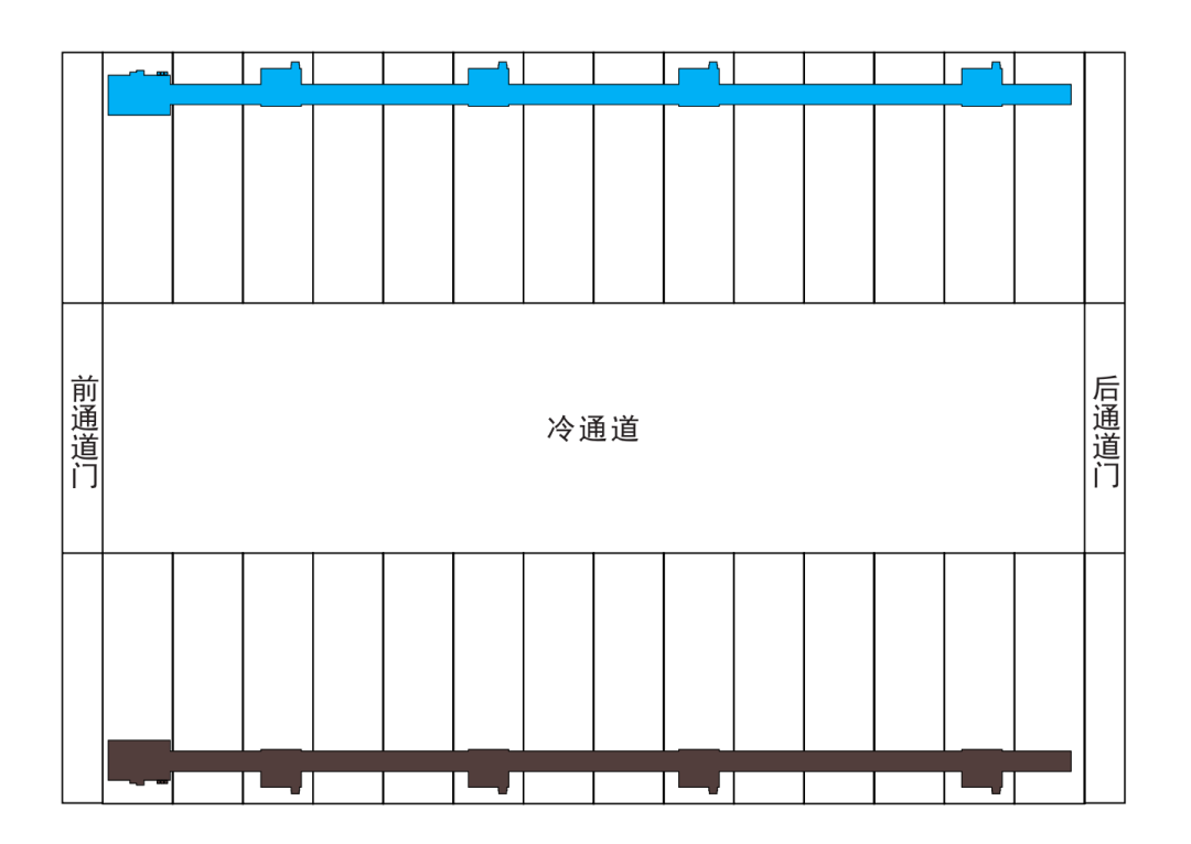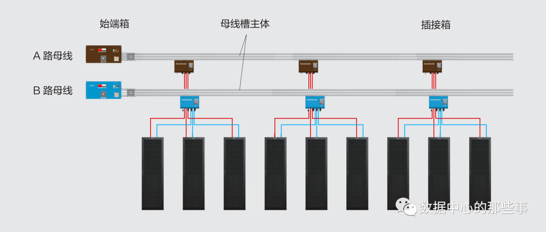 A/B路2N配置(蓝 棕),每条母线既给本列机柜供电,也需通过横向桥架跨天窗给对列机柜供电。