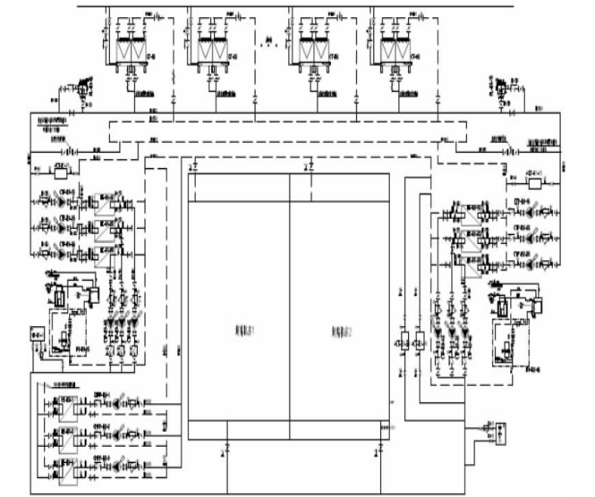 空调水系统一次侧和二次侧均为环状设置,满足系统灵活、安全运行的需求,该系统冷却塔设置于一层地面,其他设备均分设置于地下两个换热站内。
