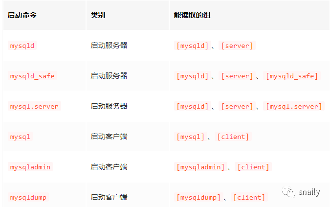 配置文件中的启动选项被划分为若干个组,每个组有一个组名,用中括号[]