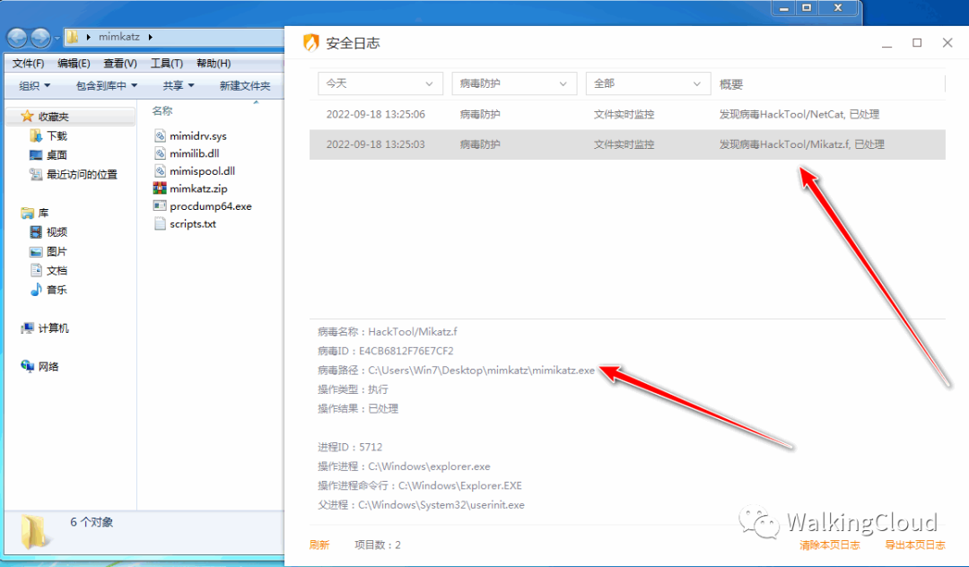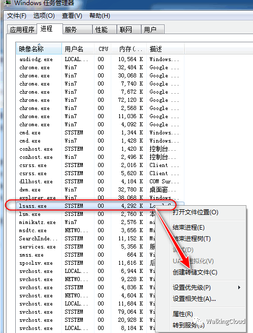 不上传mimikatz,这样不用解决杀毒软件拦截的问题,直接导出lsass.exe的dump文件