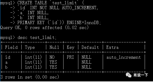 首先我们先建一张实验用表,我们就取名为 test_limit吧,建表语句如下: