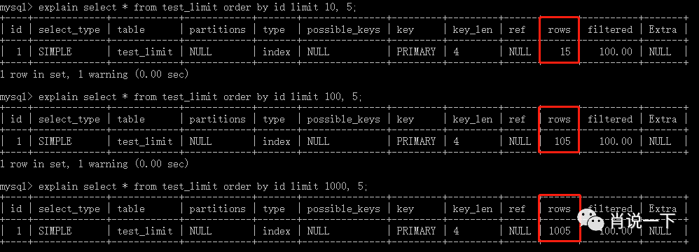 接下来我们来分析limit的原理,分别取OFFSET的值10,100,1000,最大返回数据N均为5,并通过explain来查看sql的执行计划,如下图所示: