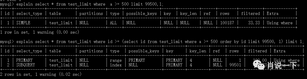 2. explain select * from test_limit order by id limit 100, 5;