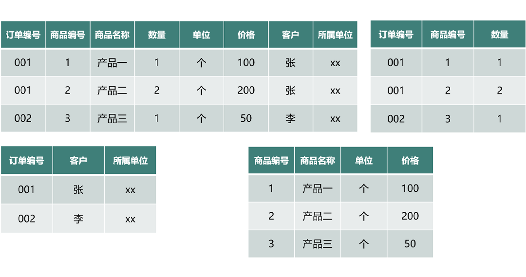 图中,以订单编号和商品编号作为联合主键,商品名称、单位、价格等信息不与主键相关,只与编号相关,违反了第二范式。应该对订单信息表进行拆分,商品信息单独一张表,订单项目一张表,如下所示,拆分分成 3 张表。