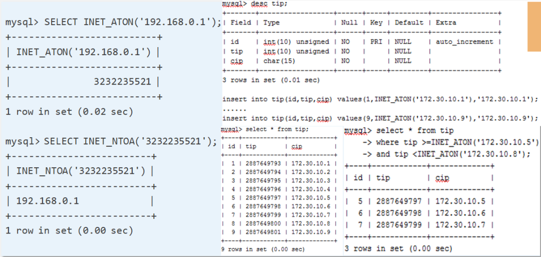 一般使用 Char(15) 进行存储,但是当进行查找和统计时,字符类型不是很高效。 MySQL 数据库内置了两个 IP 相关的函数 INET_ATON()、INET_NTOA(),可以实现 IP 地址和整数的项目转换。