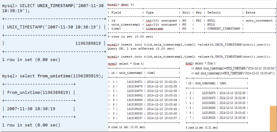同样的方法,我们使用 MySQL 内置的函数(FROM_UNIXTIME(),UNIX_TIMESTAMP()),可以将日期转化为数字,用 INT UNSIGNED 存储日期和时间。