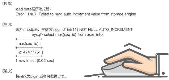 当我们使用 load data 进行批量加载数据时,会导致 1467 错误。根据分析,导致 1467 错误是由于 auto_increment 的值,超过了 int 类型的取值范围。