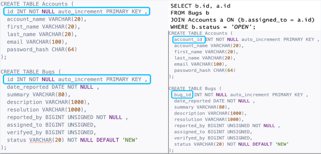 如果你的程序用的是列名,该如何区分 Accounts 表的 id 和 Bugs 的 id 呢?如下图所示,列名 id 并不会使查询变得更加清晰。但如果列名叫作 bug_id 或者 account_id,事情就会变得更加简单。
