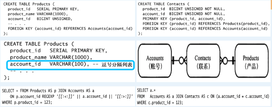 在缺陷跟踪数据库中,我们使用 Products 表中的 product_id 主键列来关联产品和对应的联系人。每个账号可能对应很多产品,每个产品又引用了一个联系人,因此产品和帐号之间是多对一的关系 随着项目日趋成熟,一个产品可能会有多个联系人,除了多对一的关系外,还需要支持产品到账号的一对多的关系。Products 表中的一行数据必须要存储多个联系人。 为了把数据库表结构的改动控制在最小范围内,我们决定将 account_id 的类型修改为 Varchar,这样可以在该列中存储多个账号 id,每个账号 id 之间用逗号分隔。 这样的设计似乎是可行的,没有创建额外的表和列,仅仅改变了一个字段的数据类型。然而,我们来看看这样的设计所必须承受的性能和数据完整性问题。所有外键都合并在一个单元格内,查询会变成异常困难。只能通过正则表达式进行模糊匹配,不但可能会返回错误的结果,而且无法使用索引提高性能。例如:查询指定产品的账号时,联合两张表将不能使用任何索引。这样的查询必然会对两张表进行全表扫描,并创建一个交叉结果集,然后使用正则表达式遍历每一行联合后的数据进行匹配。 出于性能优化方面的考虑,可能在数据库的结果中需要使用反范式的设计。上述 Products 表中将列表存储为以逗号分隔的字符串,就是反范式的一个实例。这个设计只是简化了存储,但是性能低下。因此你需要谨慎使用反范式的数据库设计。尽可能地使用规范化的数据库设计。 根据业务需求,我们如何设计合理的反范式,解决方案是:创建一个交叉表。将 account_id 存储在一张单独的表中,而不是存储在 Products 表中,从而确保每个独立的 account 值都可以占据一行。