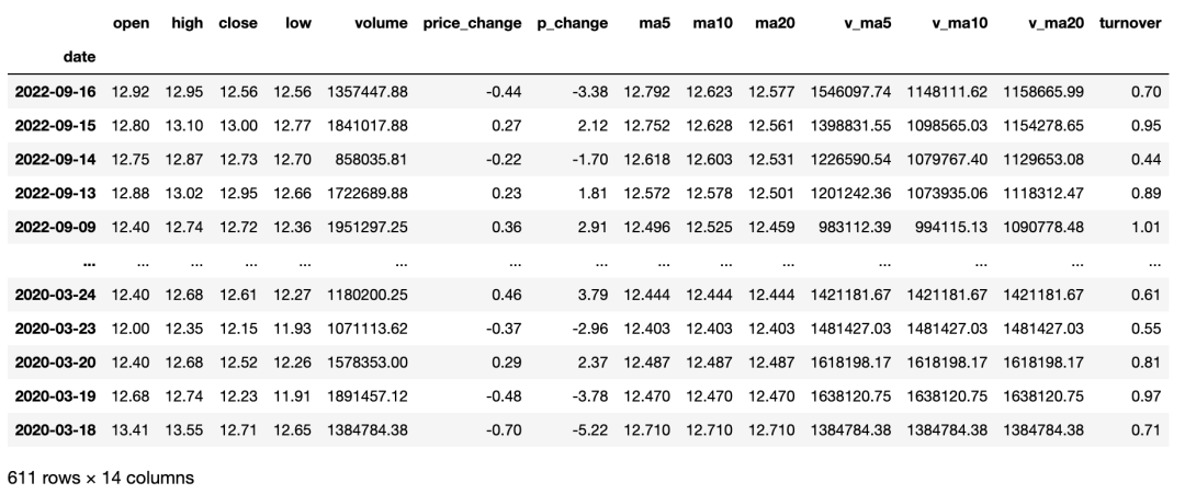 获取个股历史交易数据(包括均线数据),用户可以通过参数设置获取日K线、周K线、月K线,以及5分钟、15 分钟、30 分钟和 60分钟K线数据。本接口只能获取近3年的日线数据,适合搭配均线数据进行选股和分析。Python 代码如下: