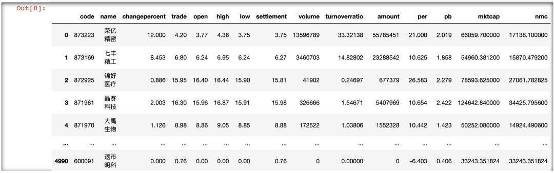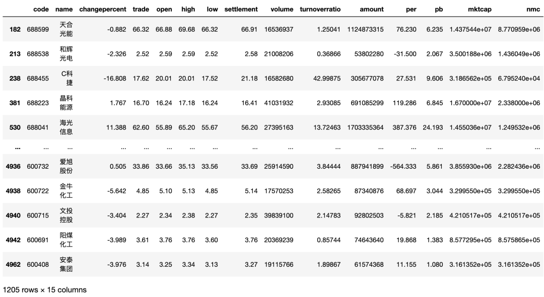 下面使用第三方库 tushare 中的 get_today_all() 两数获取所有股票的即时数据(如果是节假日,即为上一交易日)。代码如下: