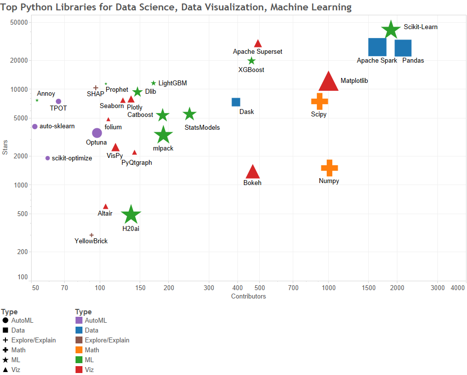 图1:用于数据科学,数据可视化和机器学习的顶级Python库,按星级和贡献者数绘制;相对大小按贡献者数量