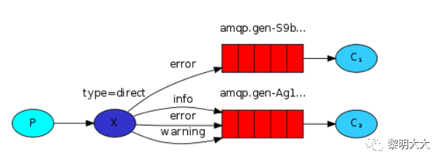 C2:消费者,其所在队列指定了需要 routing key 为 info、error、warning的消息