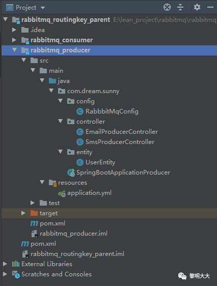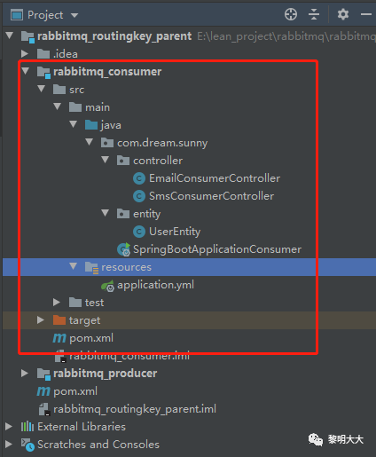 @RestControllerpublic class SmsProducerController {@Autowiredprivate RabbitTemplate rabbitTemplate;@GetMapping("/send/sms")public void send() {UserEntity userEntity = new UserEntity();userEntity.setId(new Random().nextInt());userEntity.setName("短信:" + UUID.randomUUID().toString());rabbitTemplate.convertAndSend(RabbbitMqConfig.EXCHANGE_NAME, RabbbitMqConfig.SMS_ROUTING_KEY, userEntity);System.out.println("短信生产者消息发送成功!!!");}}@RestControllerpublic class EmailProducerController {@Autowiredprivate RabbitTemplate rabbitTemplate;@GetMapping("/send/email")public void send() {UserEntity userEntity = new UserEntity();userEntity.setId(new Random().nextInt());userEntity.setName("邮件:" + UUID.randomUUID().toString());rabbitTemplate.convertAndSend(RabbbitMqConfig.EXCHANGE_NAME, RabbbitMqConfig.EMAIL_ROUTING_KEY, userEntity);System.out.println("邮件生产者消息发送成功!!!");}}