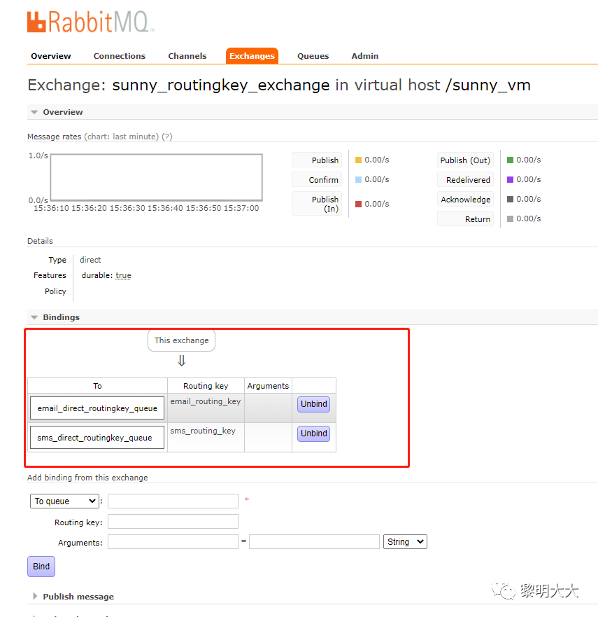 @Configurationpublic class RabbbitMqConfig {public static final String EXCHANGE_NAME = "sunny_routingkey_exchange";/*** SMS队列名称*/public static final String SMS_QUEUE_NAME = "sms_direct_routingkey_queue";/*** email队列名称*/public static final String EMAIL_QUEUE_NAME = "email_direct_routingkey_queue";/*** sms 路由key名称*/public static final String SMS_ROUTING_KEY = "sms_routing_key";/*** email 路由key名称*/public static final String EMAIL_ROUTING_KEY = "email_routing_key";/*** 声明短信队列** @return*/@Beanpublic Queue smsQueue() {return new Queue(SMS_QUEUE_NAME, true);}/*** 声明email队列** @return*/@Beanpublic Queue emailQueue() {return new Queue(EMAIL_QUEUE_NAME, true);}/*** 声明一个Direct类型的交换机** @return*/@Beanpublic DirectExchange directExchange() {return new DirectExchange(EXCHANGE_NAME);}/*** 将上面的sms队列绑定到Direct交换机** @param smsQueue* @param directExchange* @return*/@Beanpublic Binding smsQueueDirectExchange(Queue smsQueue, DirectExchange directExchange) {return BindingBuilder.bind(smsQueue).to(directExchange).with(SMS_ROUTING_KEY);}/*** 将上面的email队列绑定到Direct交换机** @param emailQueue* @param directExchange* @return*/@Beanpublic Binding emailQueueDirectExchange(Queue emailQueue, DirectExchange directExchange) {return BindingBuilder.bind(emailQueue).to(directExchange).with(EMAIL_ROUTING_KEY);}}
