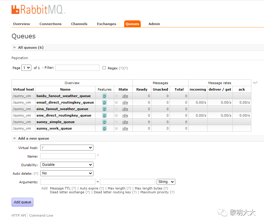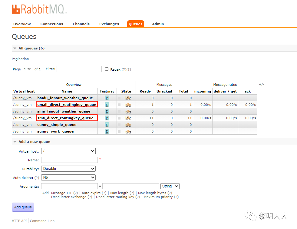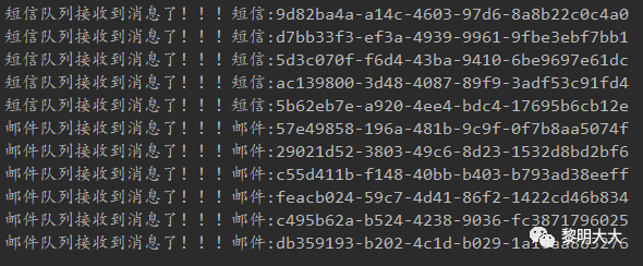 @Component@RabbitListener(queues = {"email_direct_routingkey_queue"})public class EmailConsumerController {@RabbitHandlerpublic void one(UserEntity userEntity, Channel channel, Message message) {System.out.println("邮件队列接收到消息了!!!" + userEntity.getName());}}@Component@RabbitListener(queues = {"sms_direct_routingkey_queue"})public class SmsConsumerController {@RabbitHandlerpublic void one(UserEntity userEntity, Channel channel, Message message) {System.out.println("短信队列接收到消息了!!!" + userEntity.getName());}}
