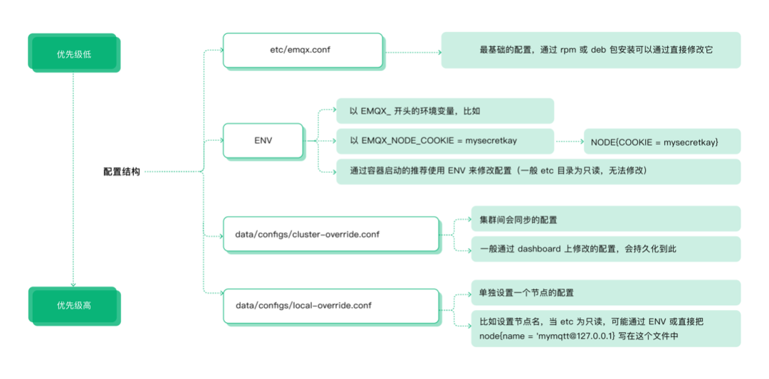 优先级从高到低,依次是 emqx.conf < ENV < cluster-override.conf < local-override.conf