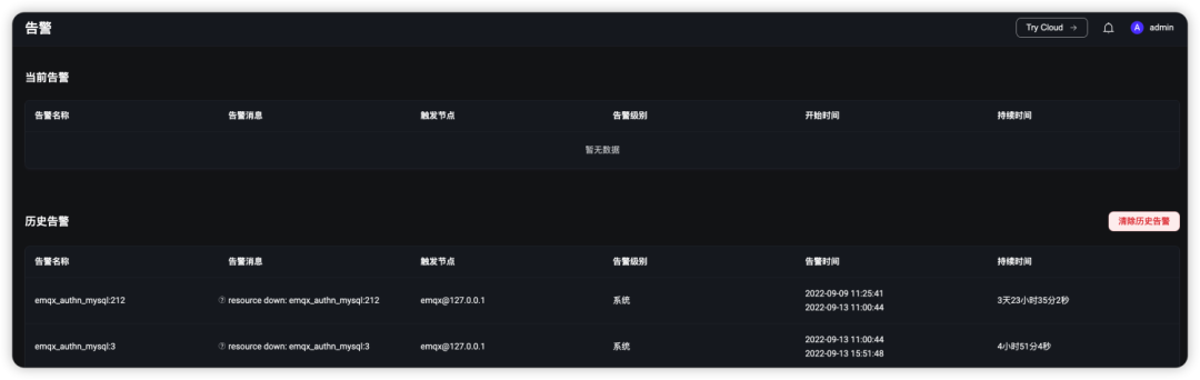 EMQX 计划在未来版本中提供告警集成 Webhook 功能,允许用户将告警事件发送到对应的告警/通知服务,如 Slack、钉钉等,用户亦可在 Web 服务中扩展实现短信或邮件告警。