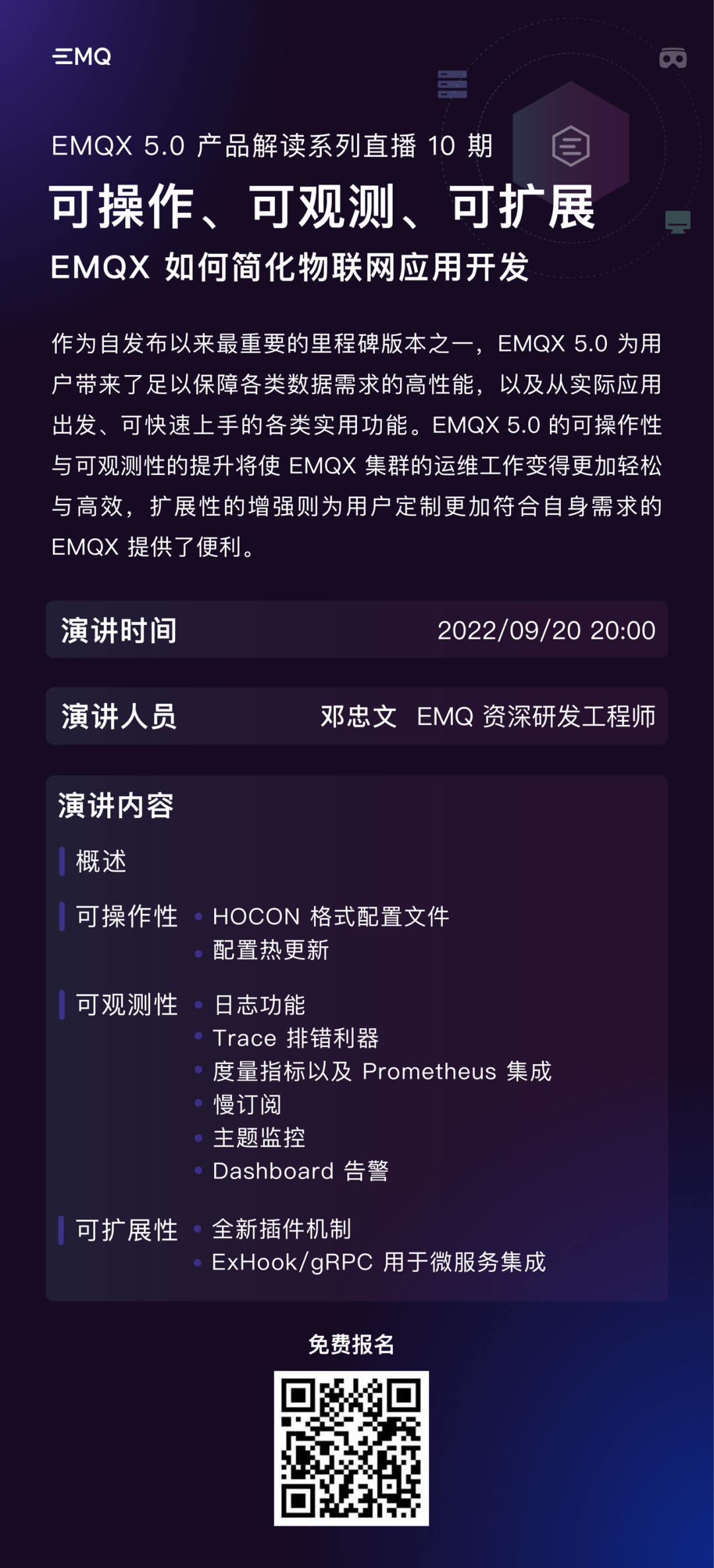 本文将从可操作性、可观测性、扩展性三个方面,与大家分享 EMQX 5.0 在运维监测、问题排查以及功能扩展中的功能优化,共同探索如何更快地利用这些优化搭建运维监控体系,为物联网业务带来更多助力。