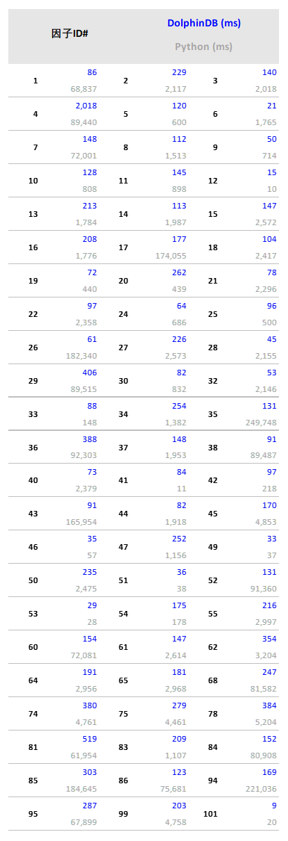 wq101alpha模块的计算效率远远高于 Python 的实现。Python 实现的耗时平均是 DolphinDB 实现的250倍,中位数为15.5倍。