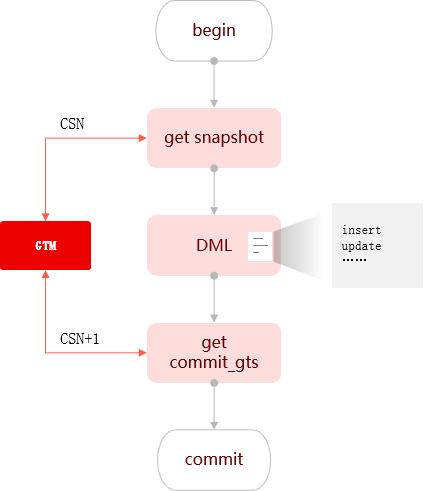 GBase 8c采用了基于全局事务提交时间戳的TSO方案,保证分布式事务一致性。处理流程如下图所示: