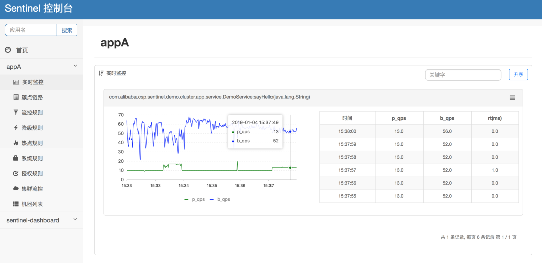 Sentinel 同时提供实时的监控功能。您可以在控制台中看到接入应用的单台机器秒级数据,甚至 500 台以下规模的集群的汇总运行情况。