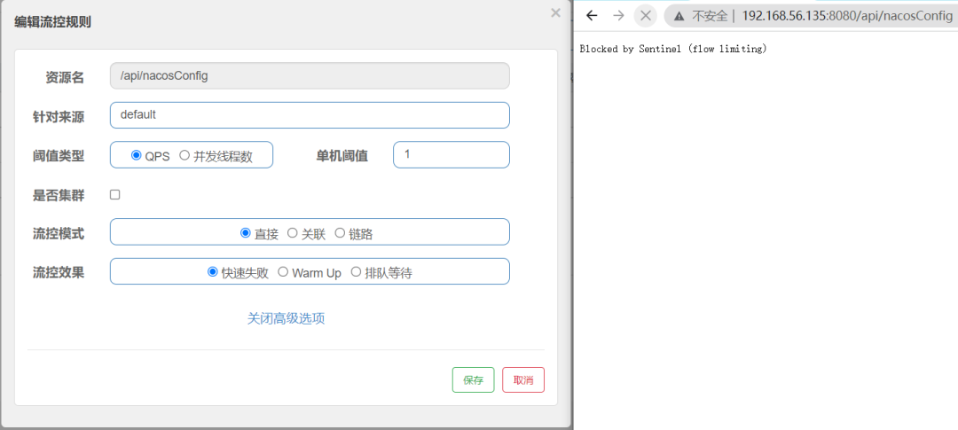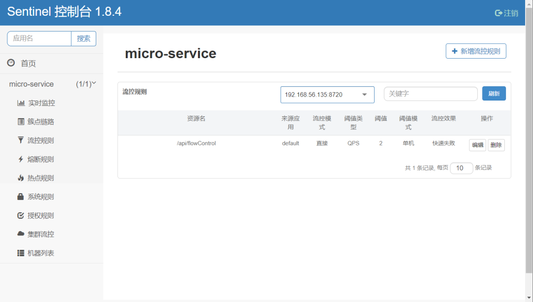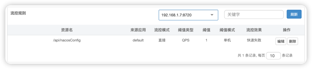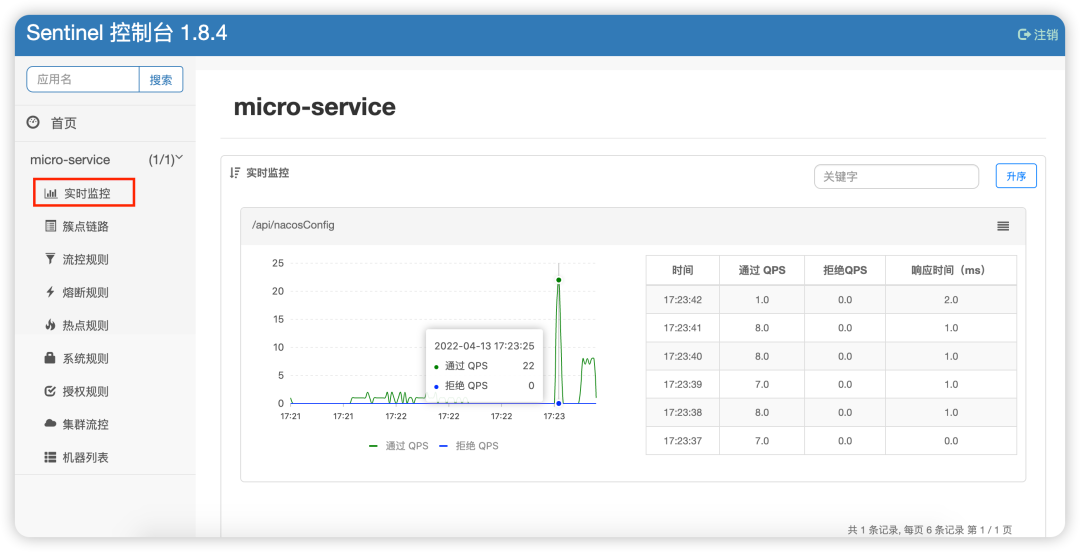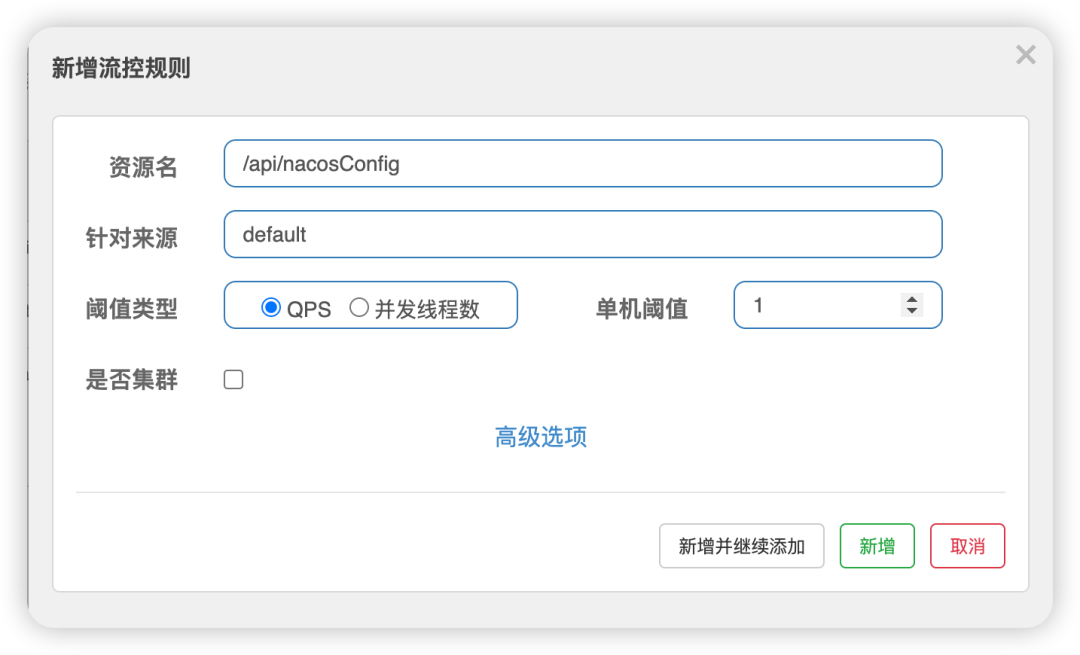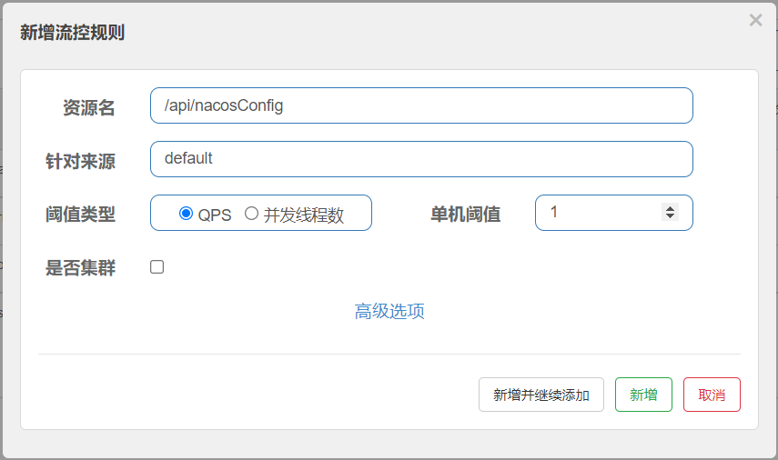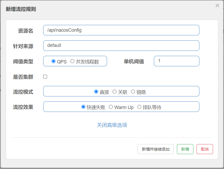 /api/nacosConfig接口每秒钟只允许 1QPS 访问,超出的请求直接服务降级返回异常。最后点击“新增”完成规则设置。