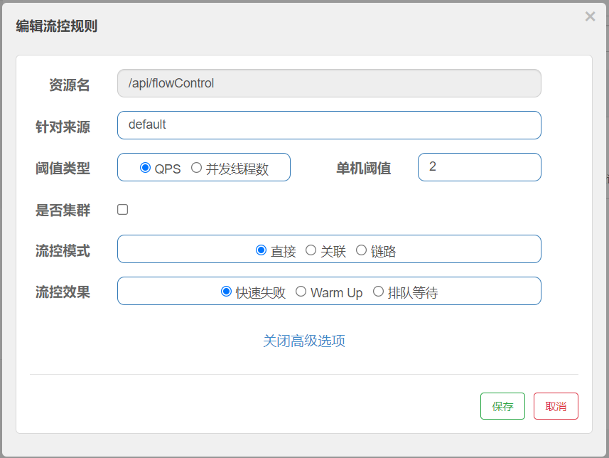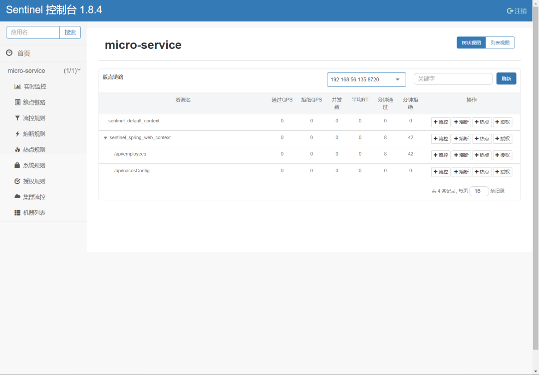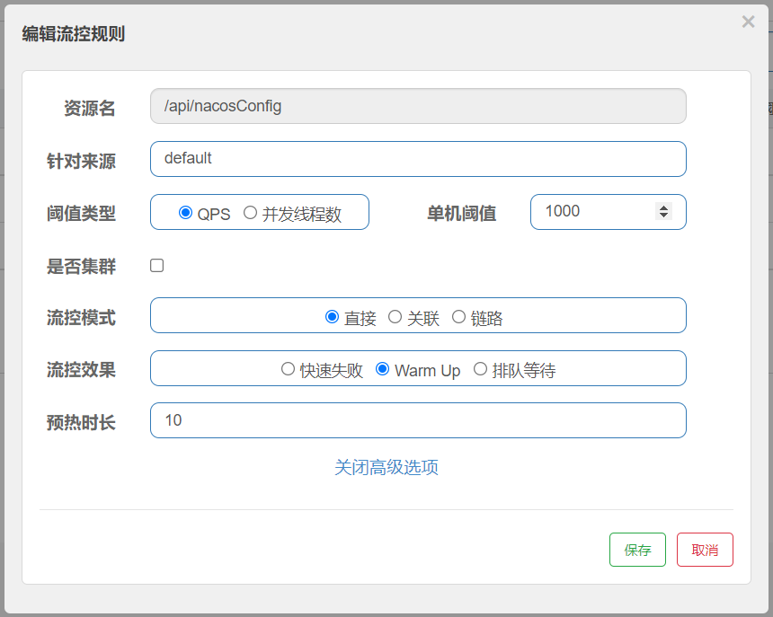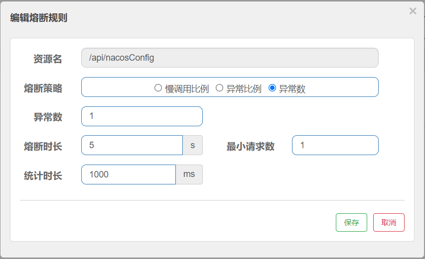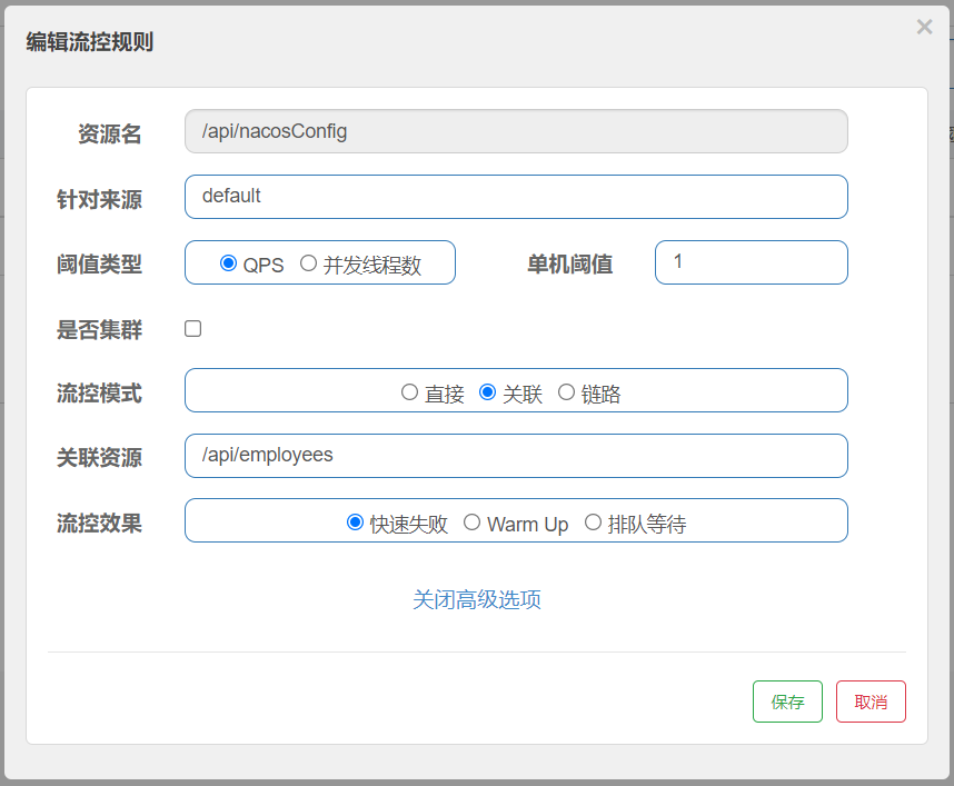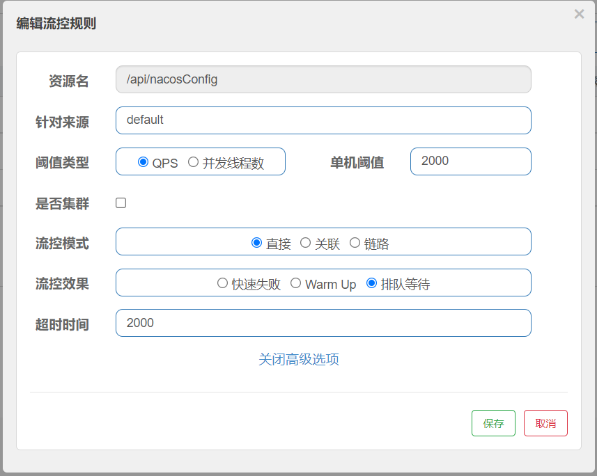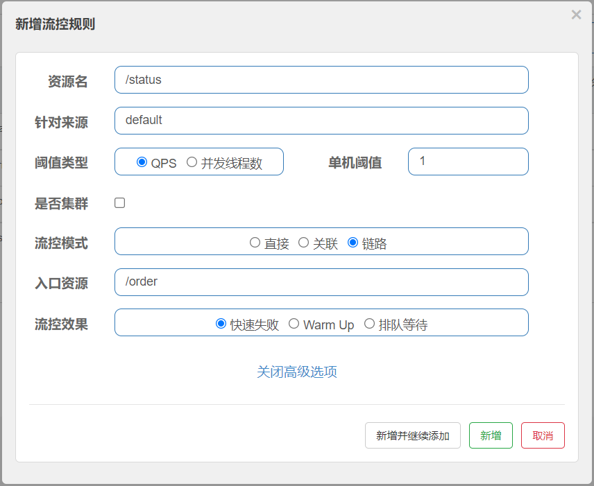 /api/nacosConfig接口每秒钟只允许 1QPS 访问,超出的请求直接服务降级返回异常。最后点击“新增”完成规则设置。