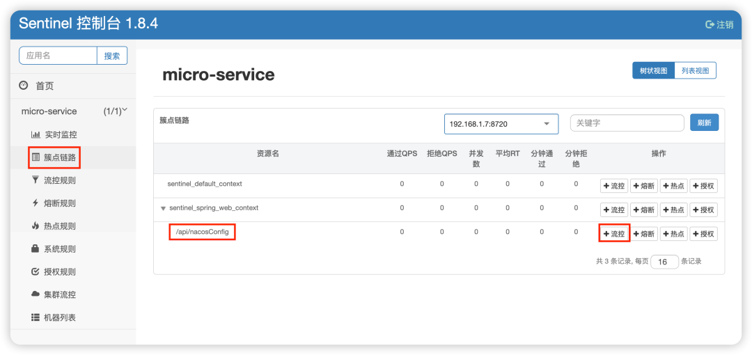 /api/nacosConfig接口的流控规则已生效,可以在“流控规则”的界面上看到。