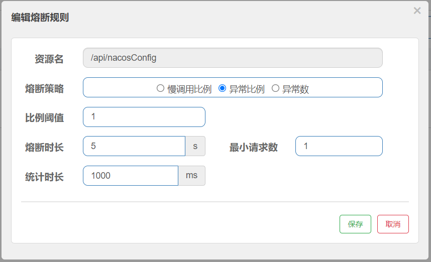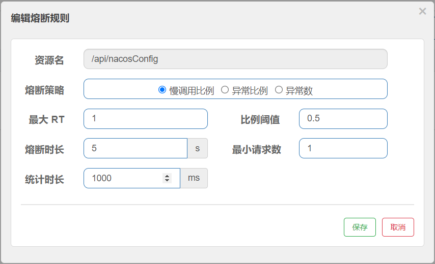 ):选择以慢调用比例作为阈值,需要设置允许的慢调用 RT(即最大的响应时间),请求的响应时间大于该值则统计为慢调用。当单位统计时长(statIntervalMs