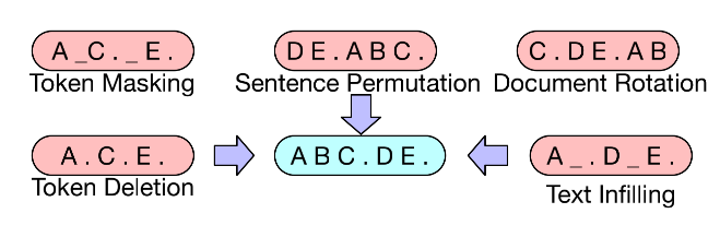 引入了降噪自编码器,丰富了文本的破坏方式。例如随机掩盖(同 MLM 一致)某些词、随机删掉某些词或片段、打乱文档顺序等,将文本输入到编码器中后,利用一个解码器生成破坏之前的原始文档。