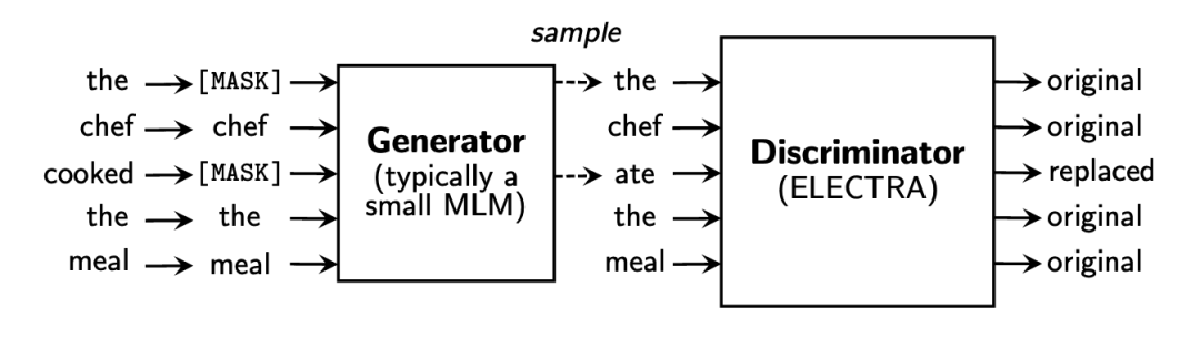 引入了替代词检测,来预测一个由语言模型生成的句子中哪些词是原本句子中的词,哪些词是语言模型生成的且不属于原句子中的词。